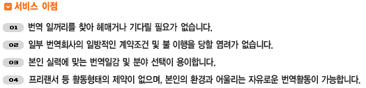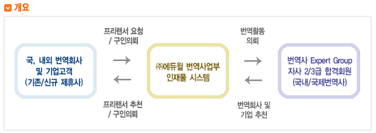 ÀÌ¿¡ ÀÚ»ç ÀÚ°ÝÃëµæ ȸ¿øÀ» ´ë»óÀ¸·Î Àü¹®¹ø¿ª»ç ÀÎÀçÇ® ½Ã½ºÅÛÀ» ±¸¼ºÇÏ¿© ¹ø¿ªÈ¸»ç¿¡¼ ÇØ°áÇϱâ Èûµç °ËÁõ µÈ ¹ø¿ª»ç¸¦ Áö¿øÇÔÀ¸·Î¼ ¹ø¿ª»ç Ȱµ¿ÀÇ Àü¹®¼ºÀ» ±Ø´ëÈ ½Ã۸ç, ¿øÈ°ÇÑ ¿ªÇÒ ¼öÇà ¹× ±ÇÀͺ¸È£¿¡ ¼ºñ½º Á¦°ø ¸ñÀûÀÌ ÀÖ½À´Ï´Ù.